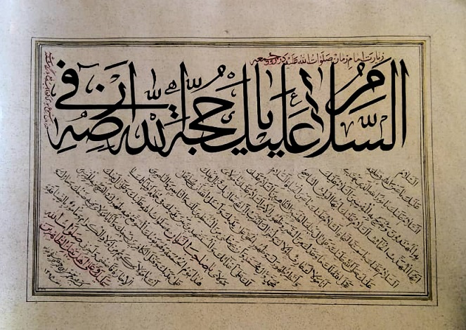 همزمان با فرا رسیدن میلاد منجی عالم بشریت اثر خوشنویسی زیارت امام زمان (عج) در روز جمعه، توسط استاد محمد نعمتی تولید و رونمایی شد.