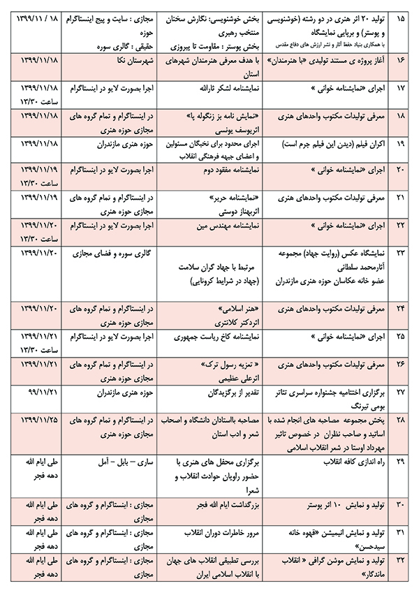 شایان ذکر است که برنامه ها و تولیدات های ایام الله دهه فجر انقلاب اسلامی حوزه هنری مازندران در سال 99 در قالب هنرهای تجسمی، نمایشی، پژوهشی، موسیقی، ادبی، تصویری، کتابخانه ای و تولیدات مجازی می باشد.