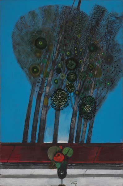 درختان ازلی ابوالقاسم سعیدی همچون اثر پیشرو، همیشه بلند و کشیده هستند. گاه برگهای انبوه دارند و گاهی شاخههای لخت سر به فلک کشیده خود را به دست باد میسپارند. حضور باد در آثار وی چنان وزان و پُرصداست، که همواره ترکیببندی موربی از درختان رقصان را ایجاد میکند؛ حتی اگر همچون اثر حاضر در پشت پنجره و در پس شیروانیهای سرخرنگ قرار گرفته باشند.اگر چه خورشید بر خلاف بسیاری از آثار سعیدی، در این اثر نمیدرخشد، اما تابش غیرمستقیم آن بر این فضای بهاری طربناک محسوس است. غیبت فیگور در آثار سعیدی، اینجا به سبب وجود گلدان گل و شیروانیهای جلوی تصویر، نشان از حضوری انسانی میدهند.