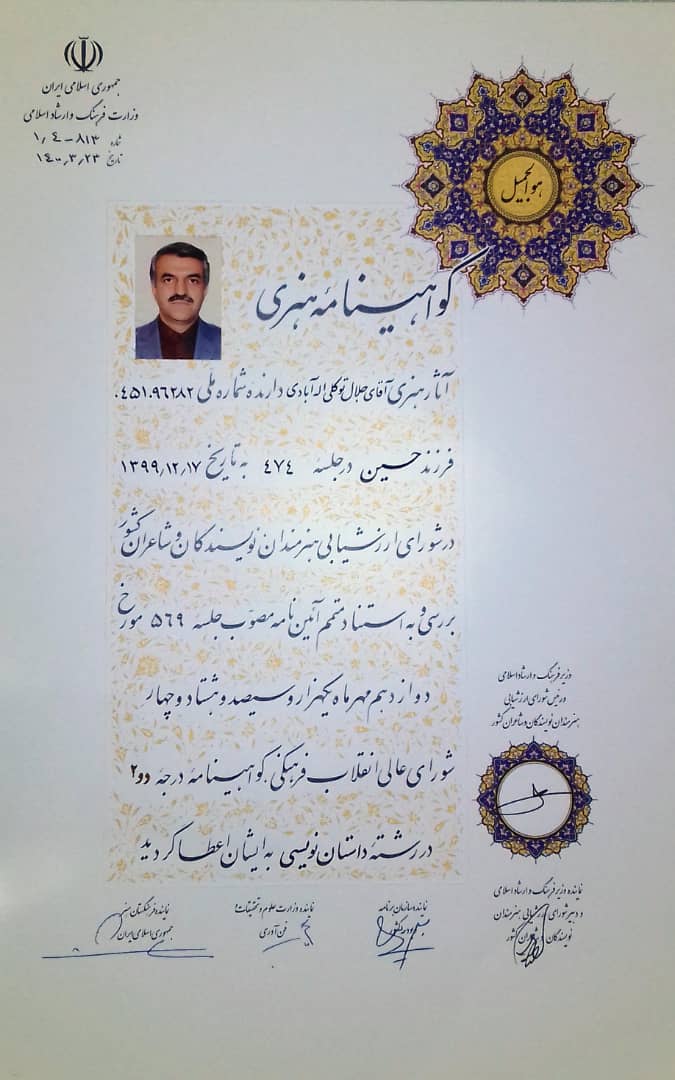 به گزارش روابط عمومی حوزه هنری استان یزد، گواهینامه درجه دو هنری در رشته داستاننویسی با تصویب و تأیید شورای ارزشیابی هنرمندان، نویسندگان و شاعران کشور به جلال توکلی نویسنده برجسته استان یزد تعلق گرفت.