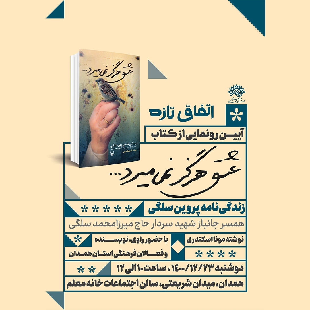 آیین رونمایی از کتاب «عشق هرگز نمی میرد» نوشته خانم مونا اسکندری و با روایتگری خانم پروین سلگی همسر شهید حاج میرزا سلگی، دوشنبه 23 اسفند 1400 در سالن اجتماعات خانه معلمان استان همدان برگزار می شود.