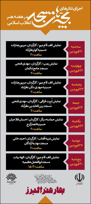 بنا بر اعلام این خبر، نمایش «الف لام میم» به کارگردانی مریم رضازاده، نمایش «پمپ» به کارگردانی مهدی فتحی، نمایش «اُپرت قزاقی» به کارگردانی مهدی فتحی، نمایش «حماسه دیگر» به کارگردانی احسان فلاحیان، «نمایش شبیه آفتاب» به کارگردانی احمد خانی در هفته هنر انقلاب در مساجد شهر کرج و نظرآباد اجرا میشوند.
