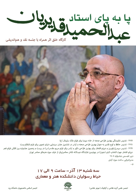 کارگاه آموزشی‌ـ‌تولیدی نقاشی و معماری با حضور استاد عبدالحمید قدیریان هنرمند برجسته عرصه هنرهای تجسمی و سینما در دانشکده هنر و معماری دانشگاه یزد برگزار می‌شود.