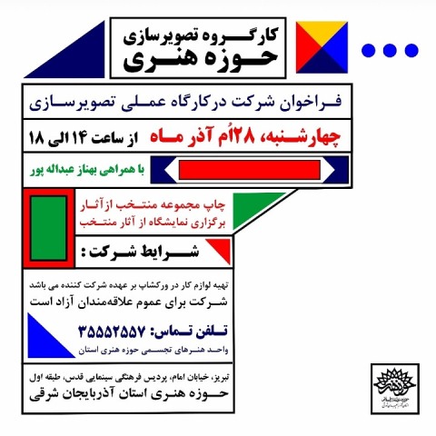 به گزارش روابط عمومی حوزه هنری آذربایجان شرقی، مسئول هنرهای تجسمی حوزه هنری استان با اعلام این خبر گفت: کارگاه تصویرسازی حوزه هنری روز چهارشنبه 28 آذر سال جاری راس ساعت 14 الی 18 در محل حوزه هنری واقع در چهار راه شریعتی، پردیس فرهنگی سینمایی قدس، حوزه هنری استان، طبقه اول – سالن جلسات برگزار خواهد شد.