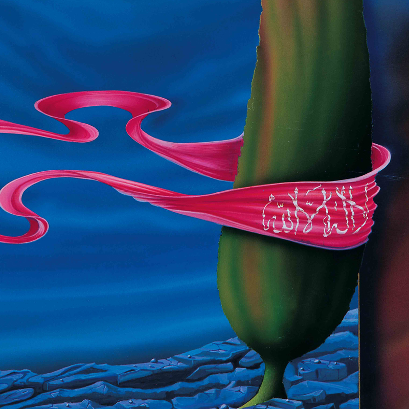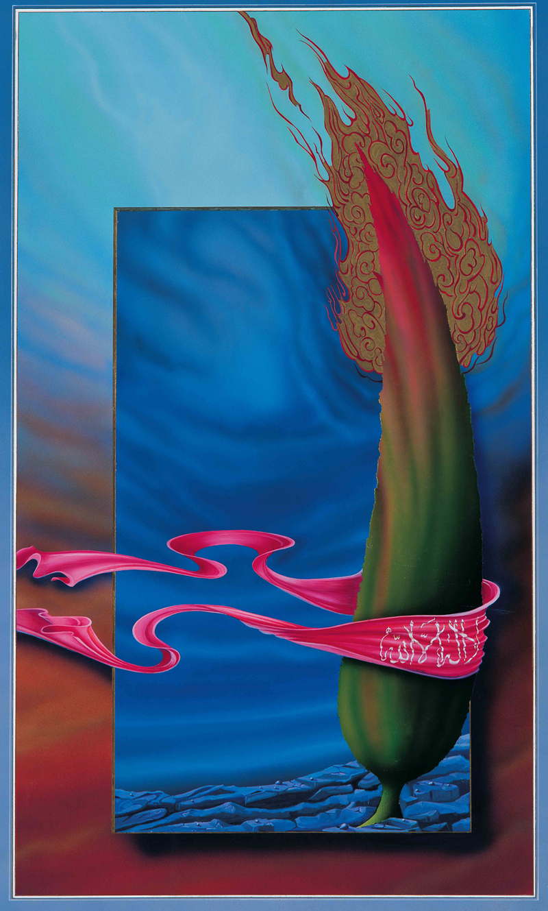 کادری در یک کادر دیگر و رنگهایی که گویی در این دنیا به تصویر کشیده نشده است. درختی که در باد می رقصد و کاکلش در حال سوختن است و و بر کمر شالی با کلامی الهی نقش بندی شده دارد. هنرمند ما را با این توضیحات به لحظه ای اشاره می دهد که خداوند در کوه طور با موسی(ع) صحبت می کند.