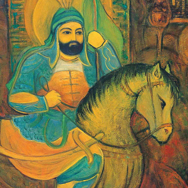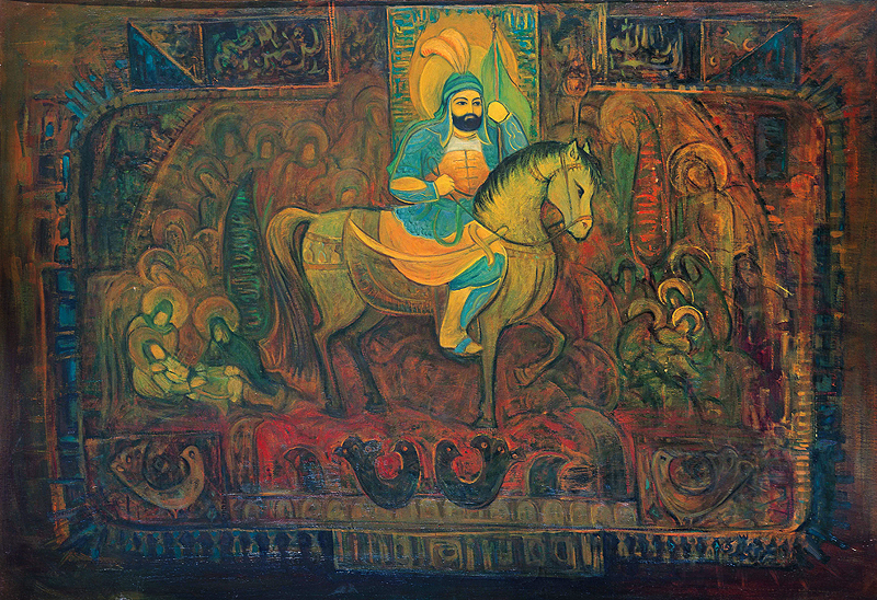 نقاش سعی می کند که قابی بسازد تا ما تمام داستان ماجرارا درک  کنیم. تابلو سرشار از عناصر بصری است ، رنگها و فیگورها – حتی از متن و کتیبه نگاری نیز بهره می گرد. همه اینها را عزیز محمدی از سنت دیرین نقاشی  ایرانی الهام گرفته است.
